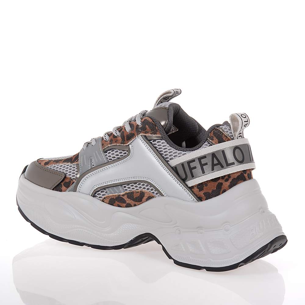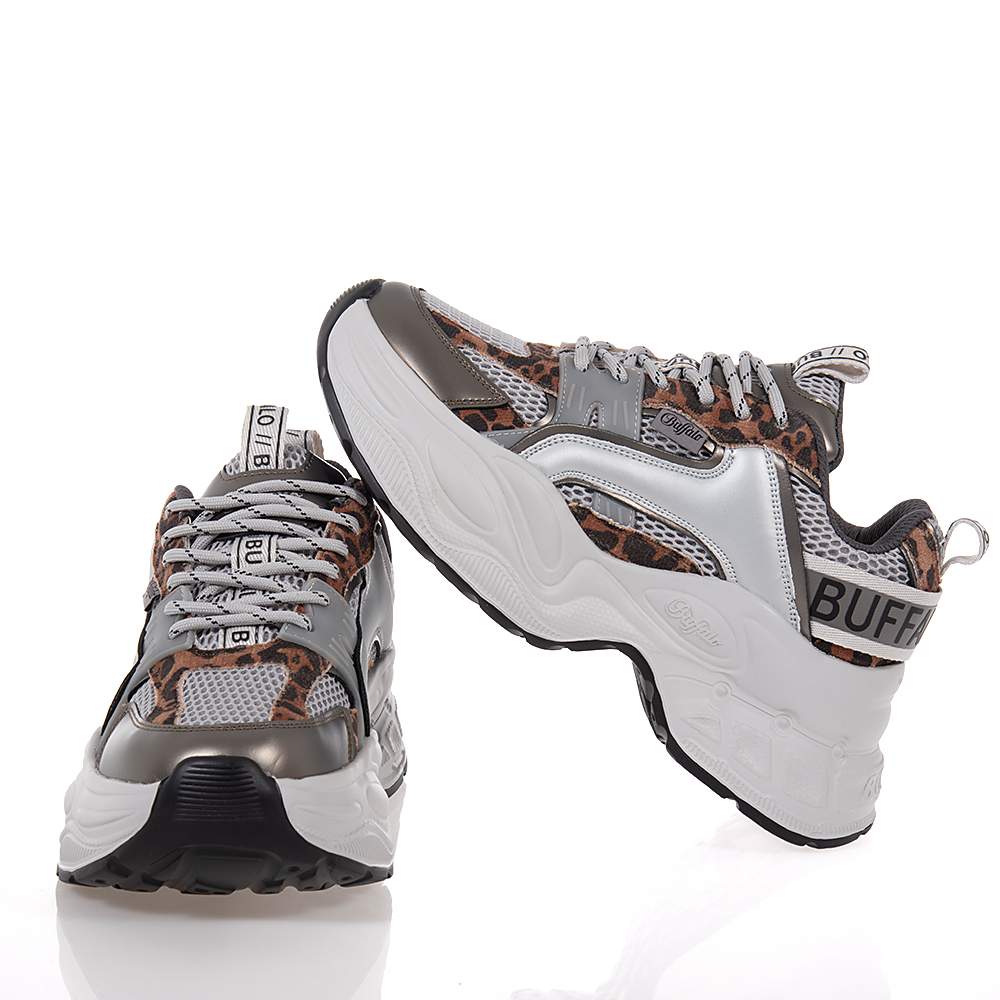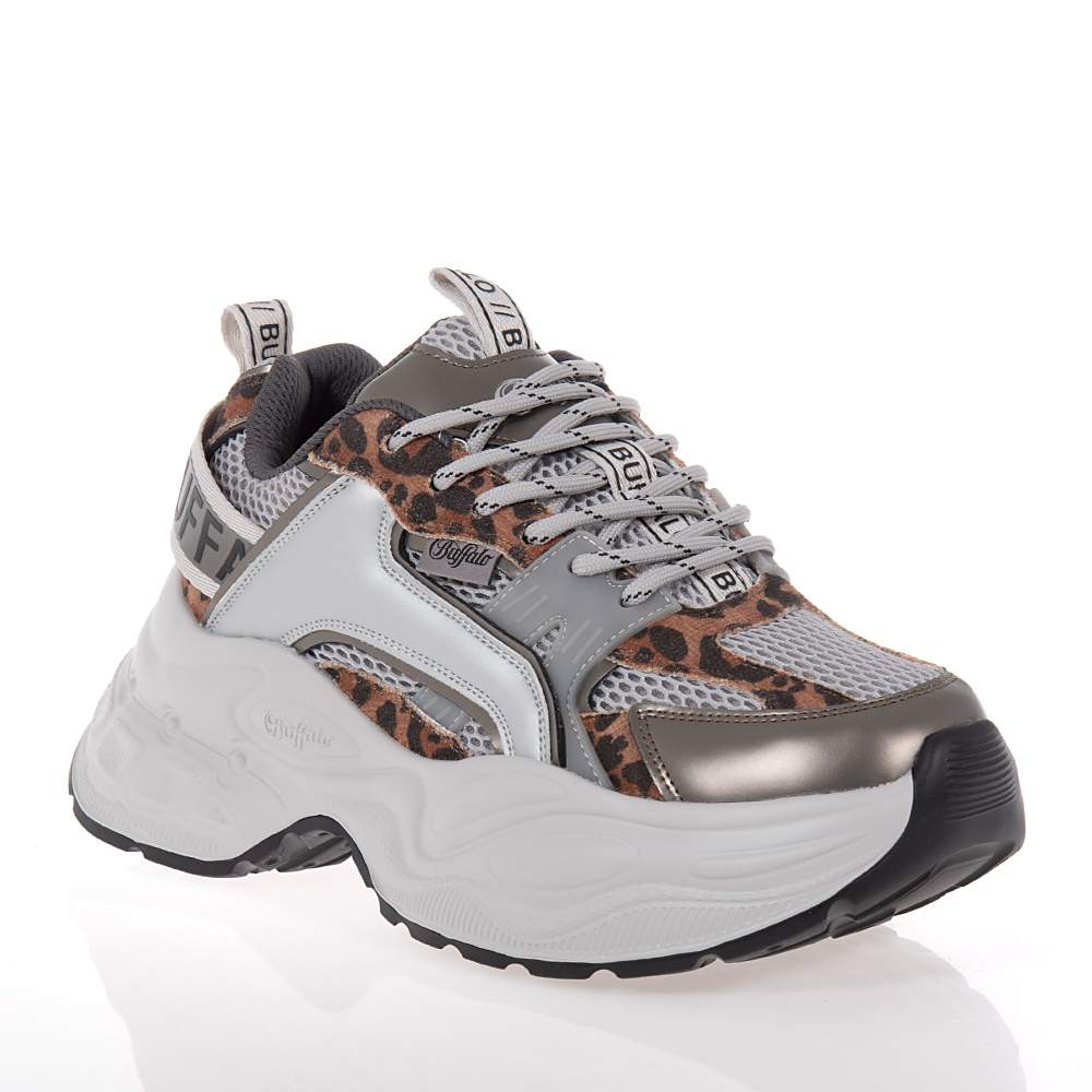 Γυναικεία sneakers Buffalo – BN1636647 δετά για σταθερό κράτημα στο βάδισμα και καλύτερη εφαρμογή. Σε γκρι χρώμα με ατσαλί και λεοπάρ λεπτομέρειες και υπέροχο μοντέρνο design θα γίνουν ο αχώριστος σύντροφός σας στις βόλτες σας. Με μαλακό πάτο και αντιολισθητική chunky σόλα.