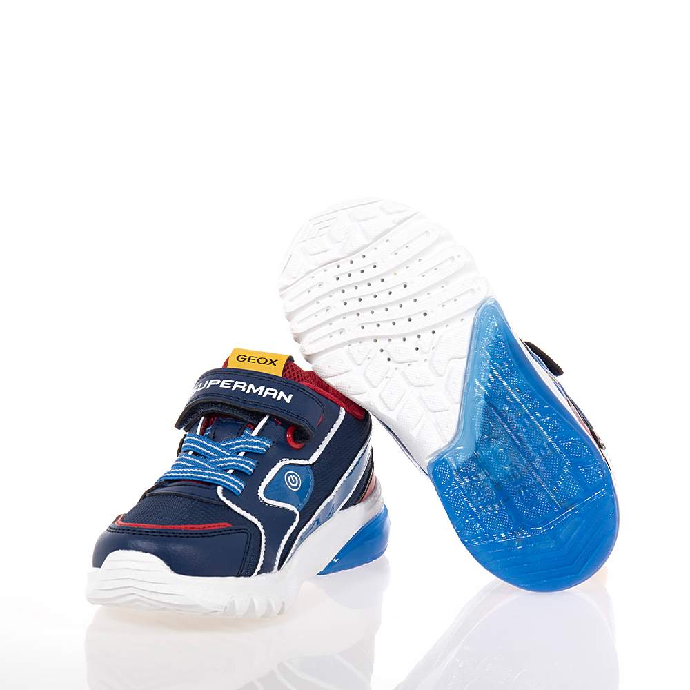 Παιδικά sneakers Geox J Ciberdron B. D – J46LBA με αυτοκόλλητο και κορδόνια λάστιχο για εύκολη εφαρμογή και αφαίρεση. Υπέροχη κατασκευή με ραφές αντοχής και κομψό design σε μπλε χρώμα με υπέροχο σχέδιο Superman στο πλάι ιδανικά για το παιχνίδι και τη βόλτα τους. Με φωτάκια που αναβοσβήνουν κατά το βηματισμό με σύστημα On/Off που θα ενθουσιάσουν τους μικρούς μας φίλους.