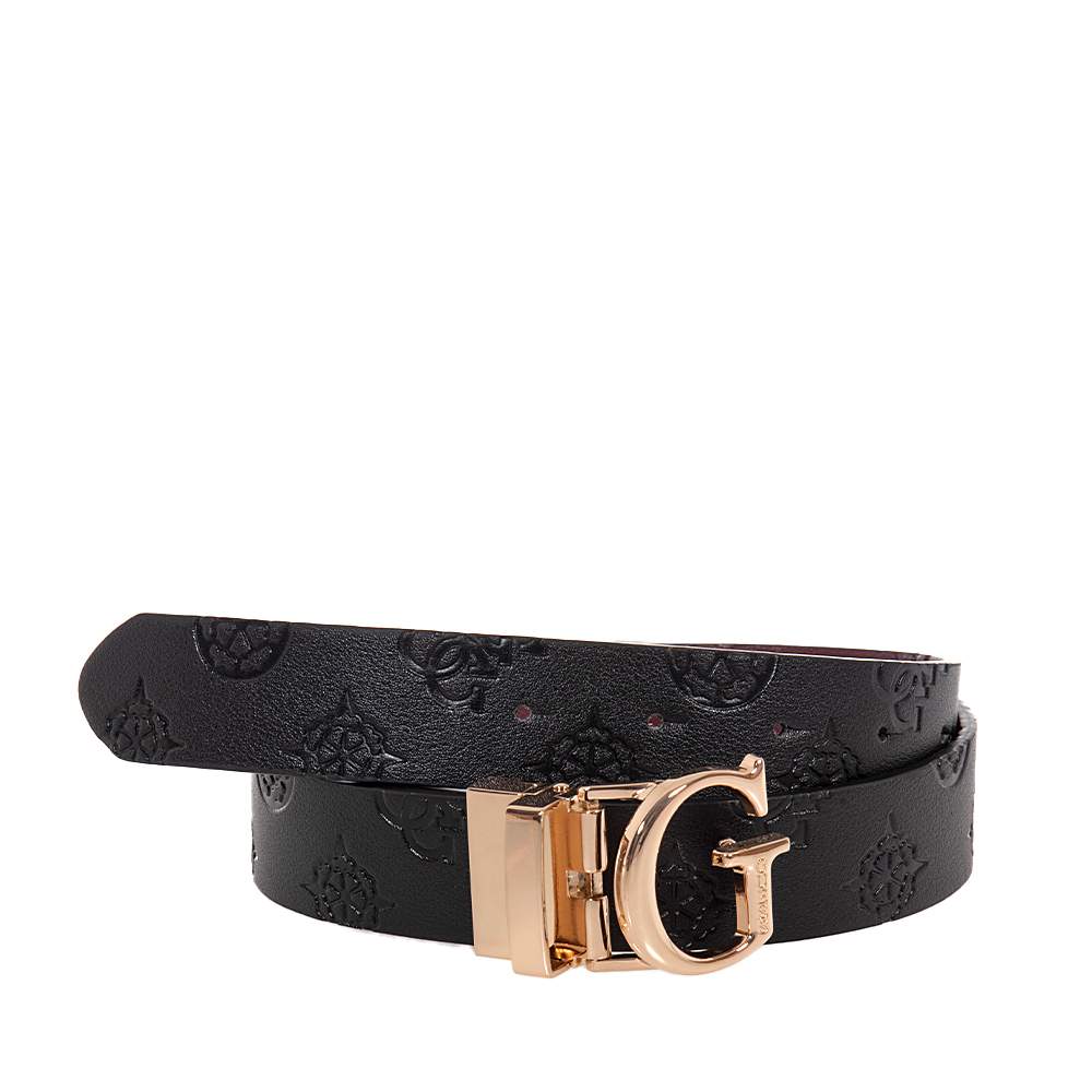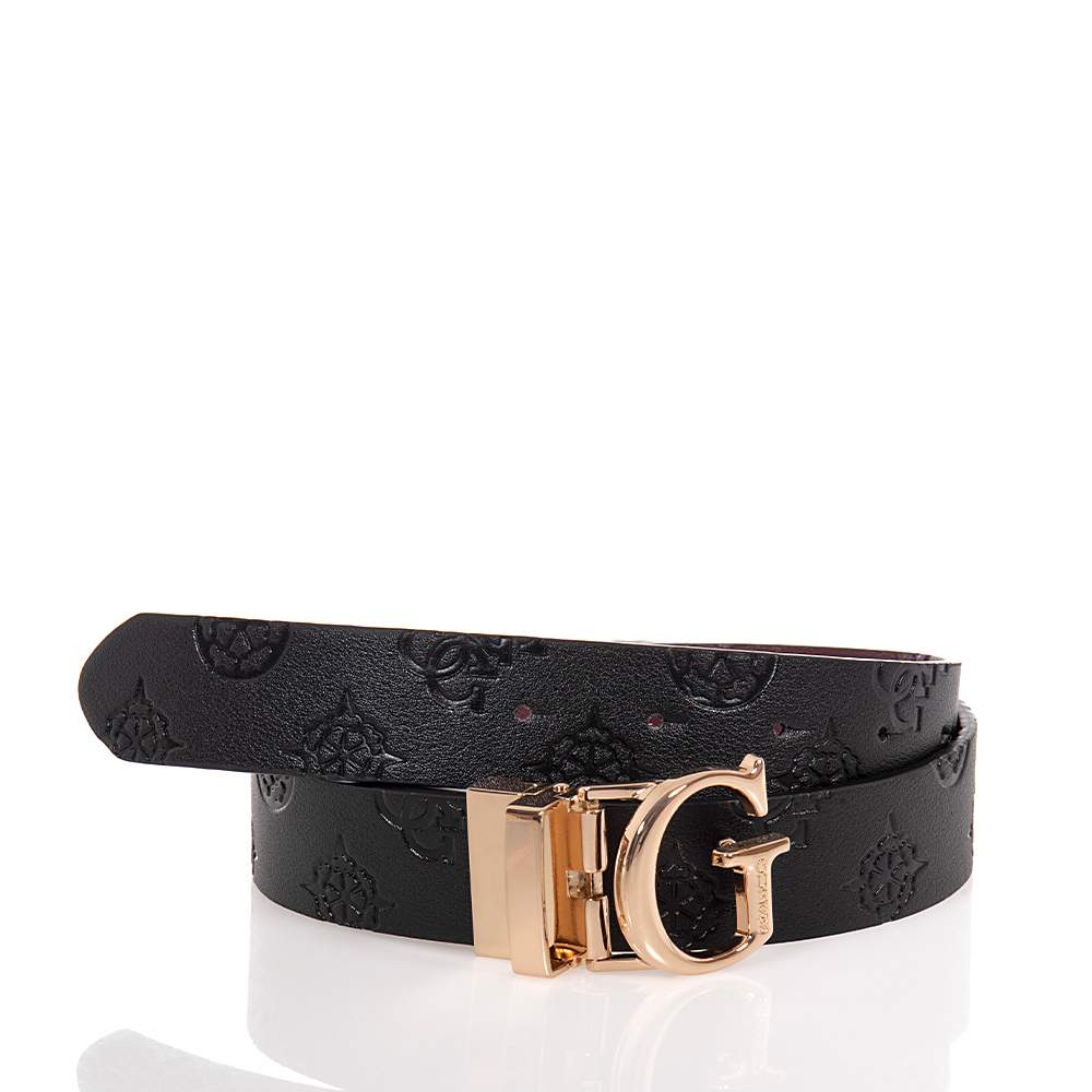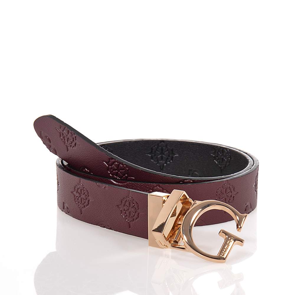 Γυναικεία ζώνη Guess – BW7861P3430 σε μαύρο και μπορντό χρώμα με σταμπωτά μοτίφ, για να συνδυάσετε με δύο διαφορετικούς τρόπους. Με ρυθμιζόμενο κλιπ με λογότυπο σε χρυσαφί αχνό χρώμα.