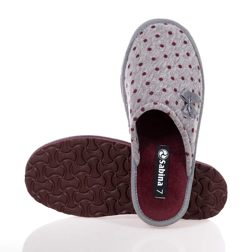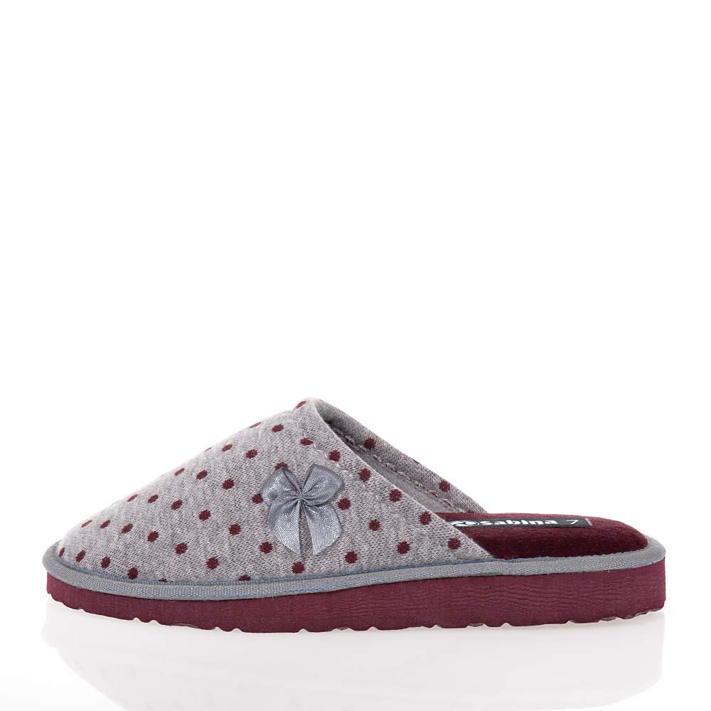 Γυναικείες παντόφλες Sabina – SA216 εξώφτερνες για εύκολη εφαρμογή και αφαίρεση σε υπέροχο γκρι-μπορντό χρώμα για να συνδυάσετε εύκολα με τα casual ρούχα σπιτιού. Διακοσμημένες με φιογκάκι και ελαφριά κατασκευή θα σας ενθουσιάσουν.