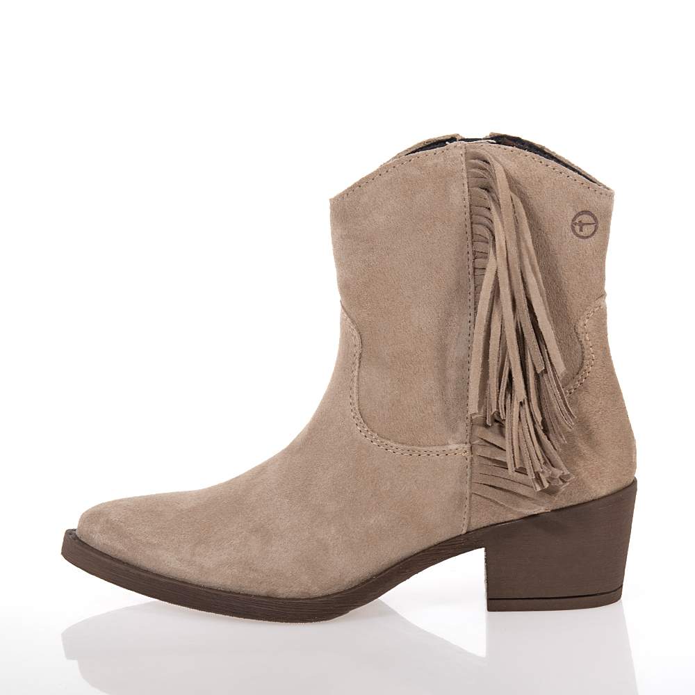Γυναικεία μποτάκια τύπου cowboy Tamaris – 25705-45 με φερμουάρ για εύκολη εφαρμογή και αφαίρεση σε μπεζ γνήσιο δέρμα και ιδιαίτερα μοντέρνο σχέδιο για να συνδυάσετε με τα jeans σας και να εντυπωσιάσετε στις βόλτες σας τα πρωινά ή τα απογεύματα. Με πάτο κατασκευασμένο με την τεχνολογία Touch-it για μέγιστη άνεση στο βάδισμα.